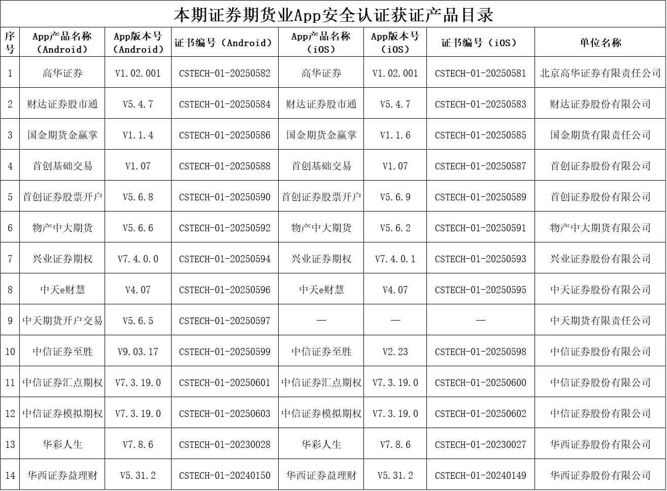 北京高華證券有限責任公司的“高華證券”App等12款App通過證券期貨業App安全認證,符合行業標準《證券期貨業移動互聯網應用程序安全規范》(JR/T 0192-2020)及《證券期貨業移動互聯網應用程序安全檢測規范》(JR/T 0240-2021)要求,獲得認證證書。